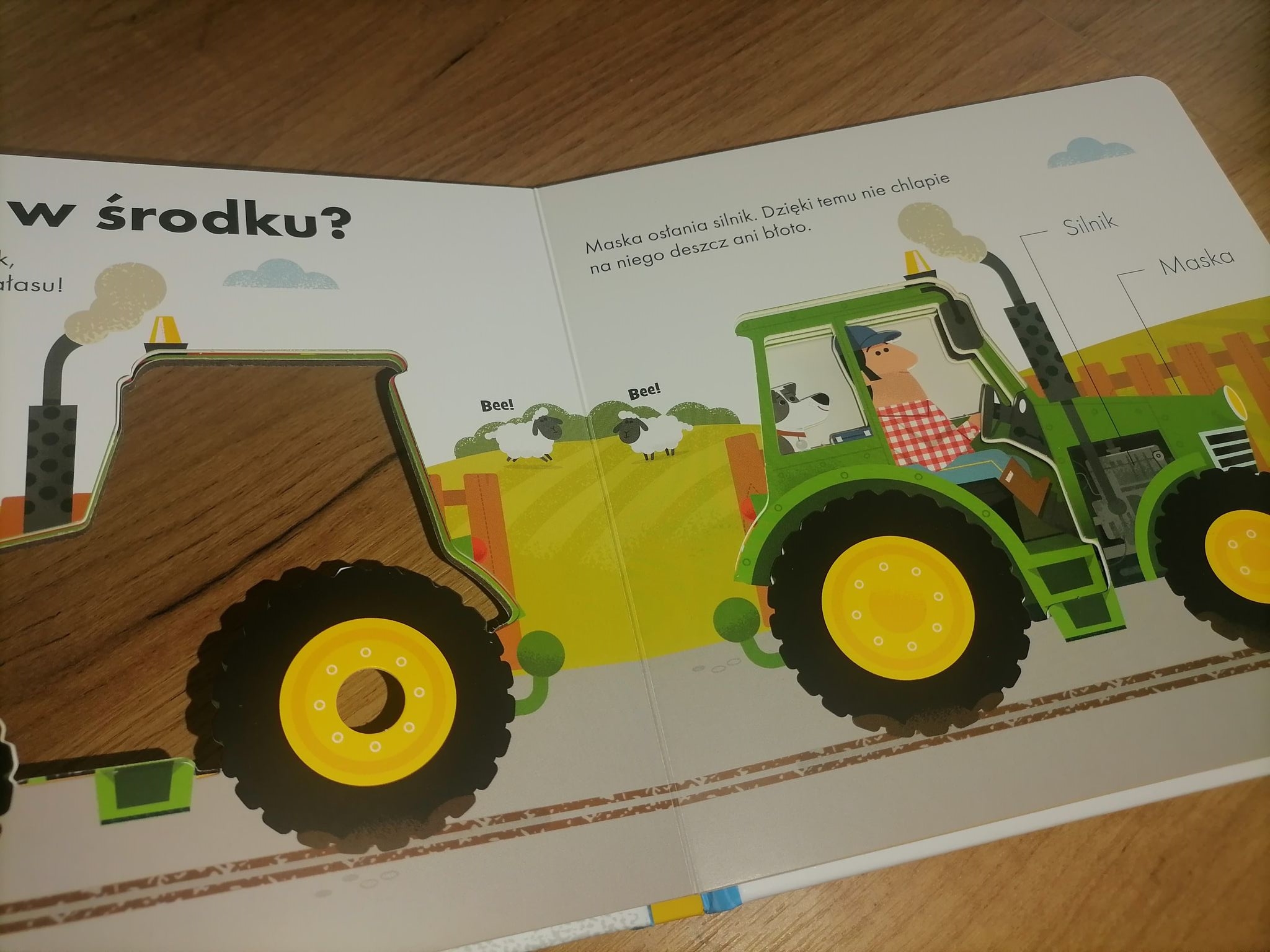 Pojazdy rolnicze, w tym traktory, to jedna z ulubionych tematyk maluchów, jeśli chodzi o książki i zabawy. I o tym właśnie jest druga publikacja, którą chcę wam dzisiaj pokazać. Co traktor ma w środku i jak działa? Co to jest kogut w traktorze i gdzie jest umieszczony? Co potrafi traktor i do czego służy? To tylko przykłady tego, czego dowiemy się z tej książki.